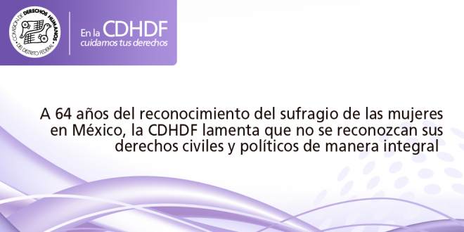 La Comisión de Derechos Humanos del Distrito Federal (CDHDF), a través de su Relatoría por los Derechos de las Mujeres y la Igualdad de Género, a 64 años del reconocimiento del sufragio de las mujeres en México, lamenta el retroceso en materia de derechos civiles y políticos de las mujeres al haberse eliminado del Código de Instituciones y Procedimientos Electorales de la Ciudad de México, la figura de violencia política en razón de género [1] y,de la Constitución Política de la Ciudad de México, el mecanismo de sanción contra la misma.